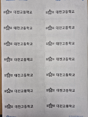 3. 라벨메이커로 디자인하여 출력합니다. 학교 교표와 학교명만 출력해도 되겠지만, 받을 대상자가 정해진 경우 엑셀로 정리한다음 라벨메이커에서 불러들여 편하게 라벨 만들 수 있습니다.(한글의 메일머지 생각하시면 됩니다.) 라벨의 오른쪽은 손잡이가 될 부분이므로 여백으로 두셔야 합니다.